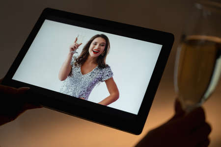 Christmas celebration. Online greeting. Virtual party. Unrecognizable woman with glass of champagne looking happy female friend congratulating on tablet computer.