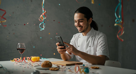 Happy young man using mobile phone at table with confetti and gingerbread