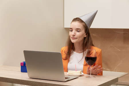 Woman with glass of wine and cake having online party via laptop at home during quarantine lockdown, closeup