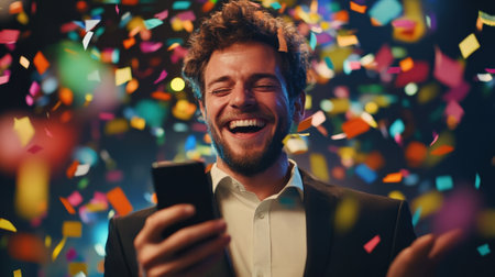 Excited businessman celebrating success with smartphone under falling confetti