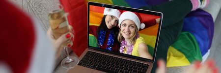 Woman communicates with girlfriends with lgbt flag by video call in laptop. Communication in same-sex marriages