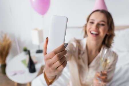 Smartphone in hand of blurred woman with champagne celebrating birthday in bedroom