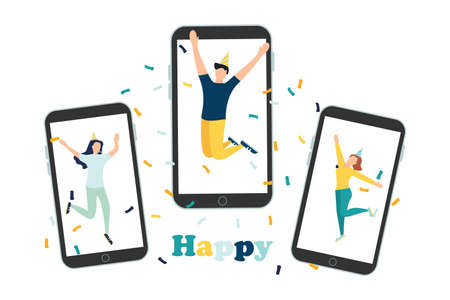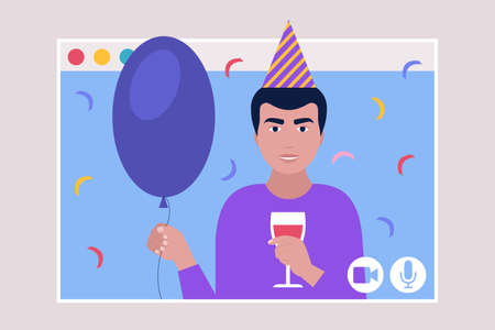 Birthday video call. Colorful flat vector illustration.