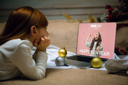 Gifts. Happy caucasian little girl during video call with laptop and home devices, looks dreamful and happy. Talking to Santa before New Years eve, her family, watching cartoons, typing text. Bokeh