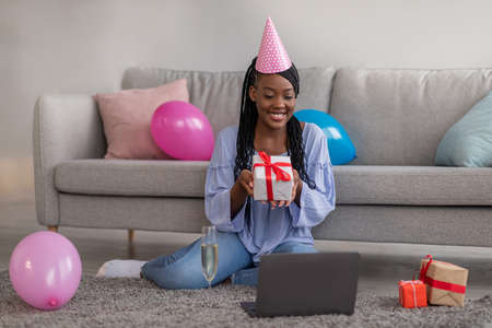 Happy young black woman with party hat holding present and smiling at laptop screen, sitting on floor by couch in living room at home, having online Birthday party during COVID-19 pandemic, copy space