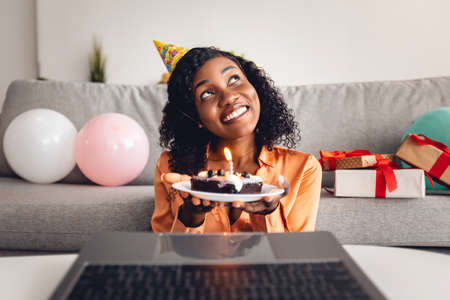 African Female Making Wish Holding Birthday Cake Near Laptop Indoor