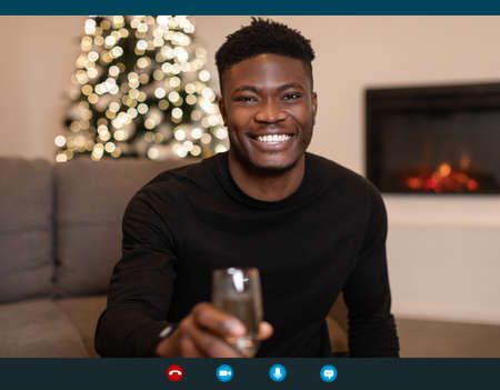 Screenshot Of Black Man Video Calling Celebrating Xmas Toasting Indoor