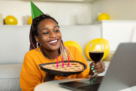 Online birthday. Happy african american woman celebrating b-day, holding pie and glass of wine, talking to laptop