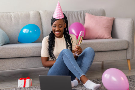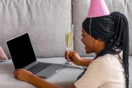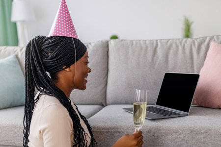 Young african american lady having online birthday party from home during coronavirus pandemic, wearing party hat, holding glass of champagne and looking at empty laptop screen, copy space