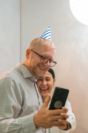 Heres a title attempting to follow all instructions: Birthday Man Woman Smartphone: Happy couple celebrates birthday via video call indoors.