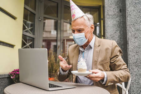 Man celebrating birthday online from home.