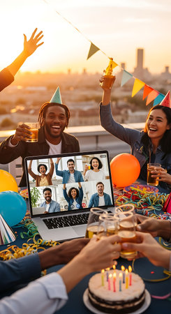 A group of diverse friends celebrating a birthday party on a rooftop at sunset, with a laptop showing a video call of other friends joining the celebration.