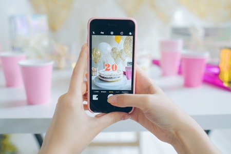 Hand on a birthday party while eating a picture with the smartphone