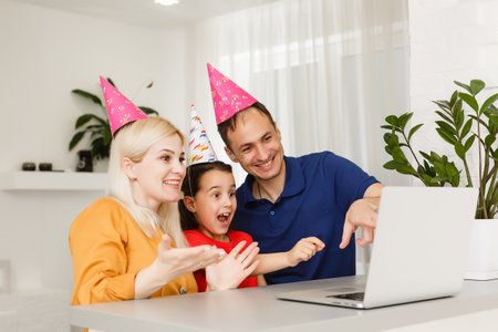Happy family celebrating birthday via internet in quarantine time, self-isolation and family values, online birthday party
