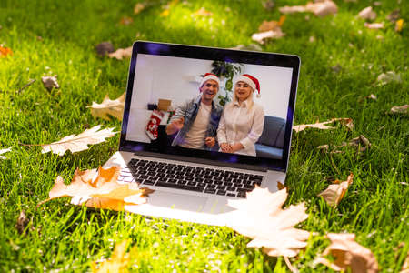 video call celebrating christmas by laptop online during coronavirus outbreak