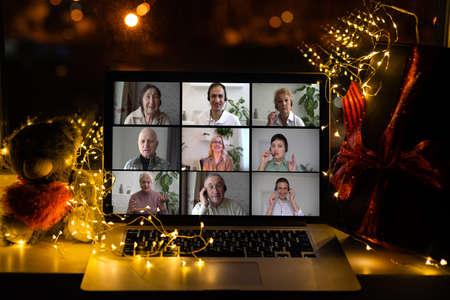 Virtual Christmas meeting team teleworking. Family video call remote conference Computer webcam screen view. party online