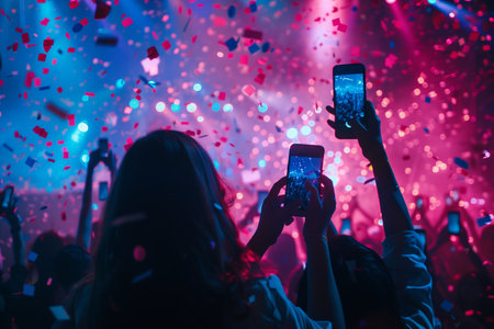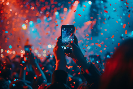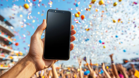 A mobile phone held up at colorful festival with confetti and cheering crowd