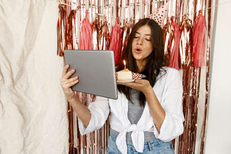 Make a wish! Happy young woman in pink birthday cap holding cake and tablet and blowing candle in festive decorated room. Birthday celebration through video call with family due to coronavirus