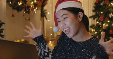 Asia people woman micro influence or vlogger smile fun online wishing talk to VoIP camera call on social media digital tablet laptop at cozy home table. Merry Xmas eve with candle bokeh tree light.