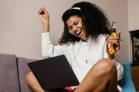 Young black woman in headphones drinking bear while using laptop at home