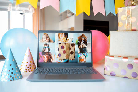 Kids virtual birthday,home party.Online conference,video call in laptop,computer.Friends girls on screen,greetings.Decoration,gifts,balloons,flags,caps.Children celebrate remote holiday on isolation