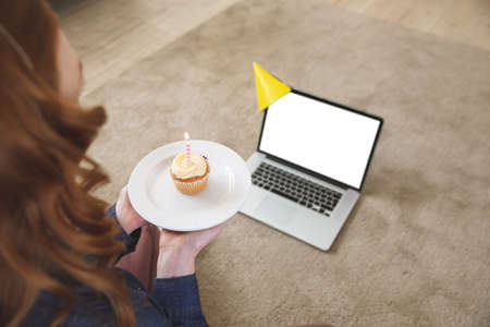 Caucasian woman spending time at home, in living room, using laptop, celebrating and holding a cupcake with a candle. Social distancing during Covid 19 Coronavirus quarantine lockdown.
