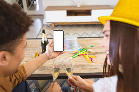 Happy biracial couple enjoying virtual party during video call on smartphone with copy space. celebration, lifestyle and telecommunications.