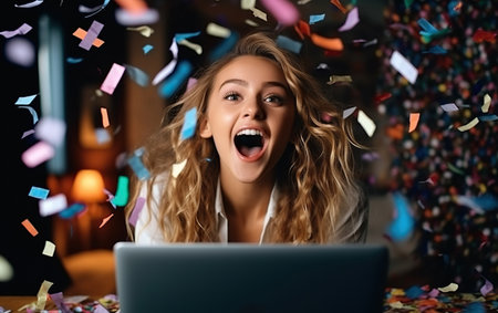 A beautiful model girl celebrating in front of a laptop