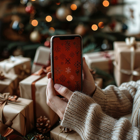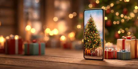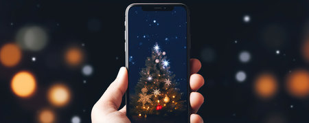 A person is holding a cell phone and looking at a Christmas tree on the screen. Concept of warmth and holiday cheer, as the person is likely enjoying the festive decorations