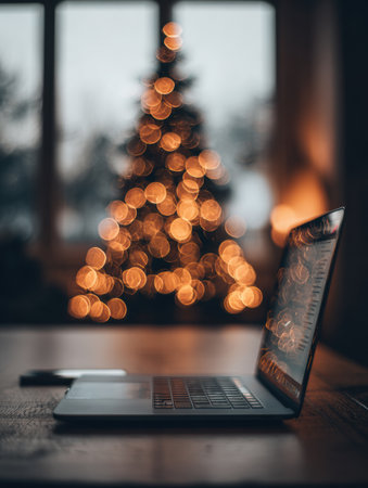 A laptop sits on a wooden desk, illuminated by warm Christmas tree lights in the background, creating a cozy atmosphere in the winter evening.
