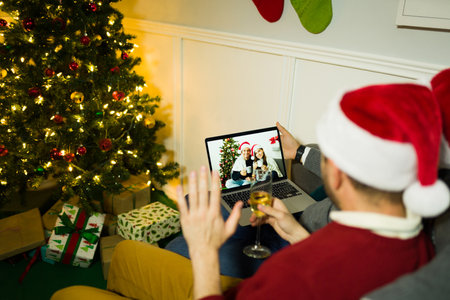 Gay couple saying hi during a video call to family or friends while relaxing during a christmas at home