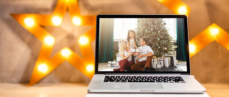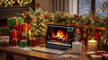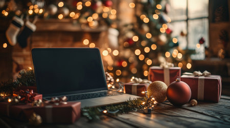 A cozy holiday scene featuring a laptop on a wooden table, surrounded by Christmas decorations, gifts, and glowing lights, perfect for remote holiday celebrations.