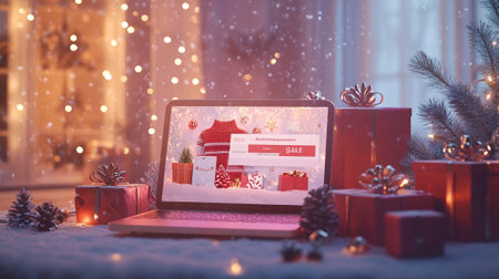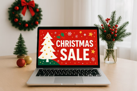 Christmas sale online displayed on laptop screen with festive decor including wreath and small christmas tree. concept of holiday shopping, digital discount, seasonal promotion.