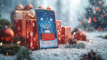 3D Christmas online shopping concept, a modern smartphone showing a holiday sale page, surrounded by wrapped gifts, ornaments, and pine branches. A snowy winter background.
