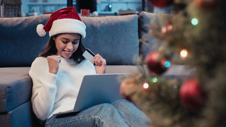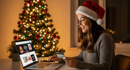 A smiling woman in a Santa hat shops online during Christmas, holding a credit card and using a laptop in a cozy, festive environment, ideal for holiday advertising.