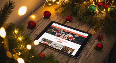 A festive scene showcasing a tablet displaying Christmas online shopping, surrounded by decorations, perfect for advertising or editorial content.