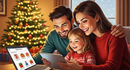This warm illustration shows a family joyfully shopping online during the holidays, perfect for advertising campaigns, promoting sales, and illustrating family togetherness.