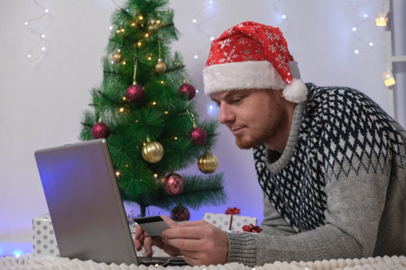 Man with laptop and credit card buys gifts for New Year 2023, Christmas. A man in Santa hat on the background of Christmas tree, garlands, gifts with a laptop. Cybersecurity from scammers. Neon bokeh.