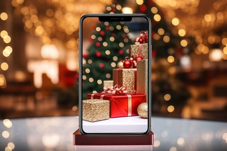 Mockup smartphone with blank screen on white table with christmas tree and gifts.