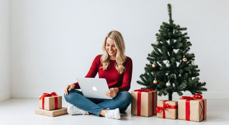 A woman sitting on the floor with a laptop, surrounded by Christmas presents and a decorated tree