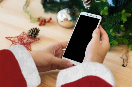 Santa holding smartphone with blank screen