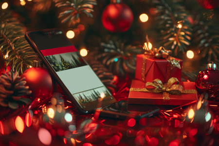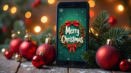 A sleek smartphone stands amidst a festive arrangement of red ornaments and evergreen branches, showcasing a cheerful Merry Christmas message against a snowy backdrop. The warm glow of twinkling lights and the sparkling decorations create a cozy, joyful atmosphere, inviting the spirit of the holiday season.