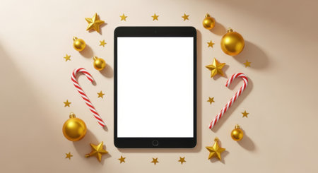 A tablet with a blank screen is surrounded by Christmas decorations, including golden ornaments, stars, and candy canes, creating a festive holiday scene.