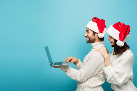side view of happy couple in santa hats and warm sweaters looking at laptop on blue