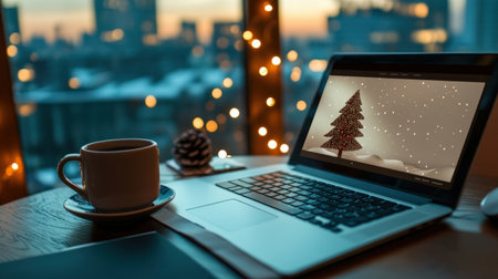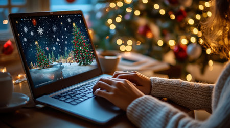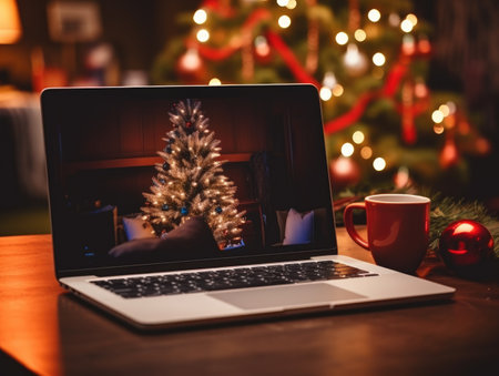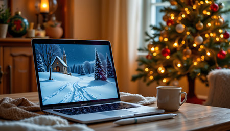 a cozy scene of a laptop displaying a festive christmas view, placed on a table near a decorated christmas tree. the screen shows a snowy winter landscape, while the tree sparkles with ornaments and fairy lights. the warm, softly lit room with wooden accents and a mug of cocoa creates a holiday ambiance, ideal for tech or seasonal promotions