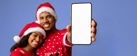 Couple Celebrating Christmas Wearing Festive Attire and Showing Phone With Blank Screen