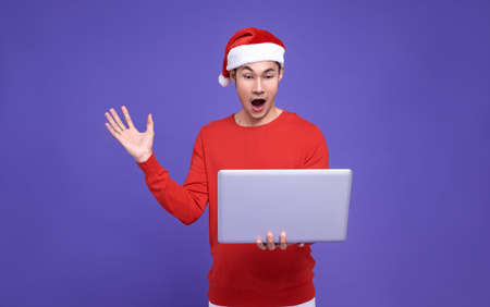 Young asian man in red casual attire wearing Santa hat and holding laptop and looking at screen excited face and surprise hand on purple background.Happy new year concept.