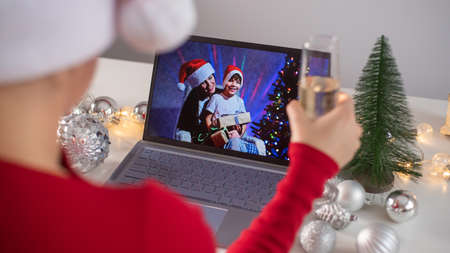 Caucasian woman calls family online on laptop and wishes a Merry Christmas. Remote meeting of the new year