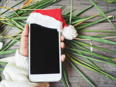 Smart phone with christmas hat on hand