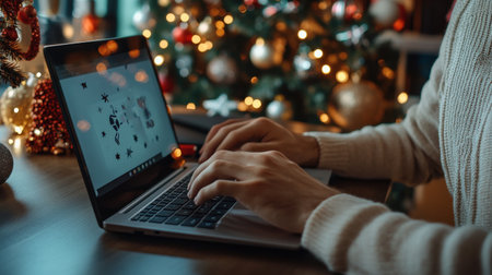 Person using a laptop for online shopping during Christmas, with gifts and festive lights in the background.